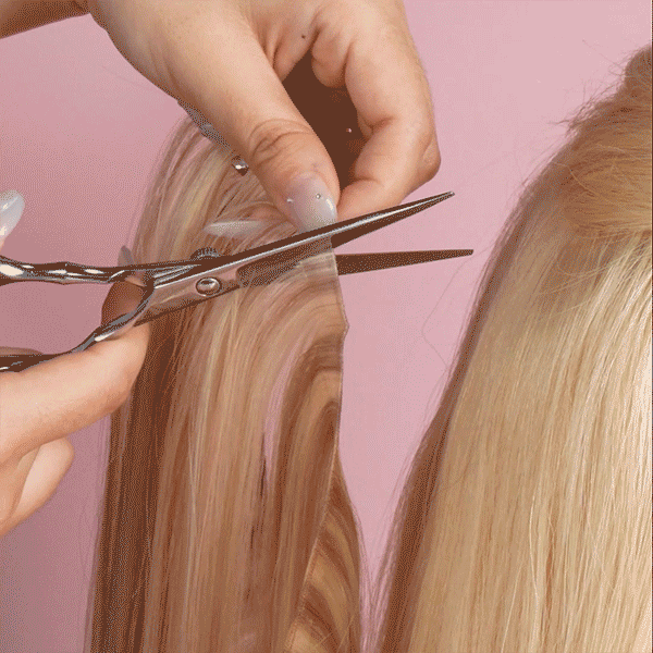 Remove the tape backing and position the weft close to the scalp—never directly on it. Lay it underneath or on top of the sectioned hair, depending on your preferred method.