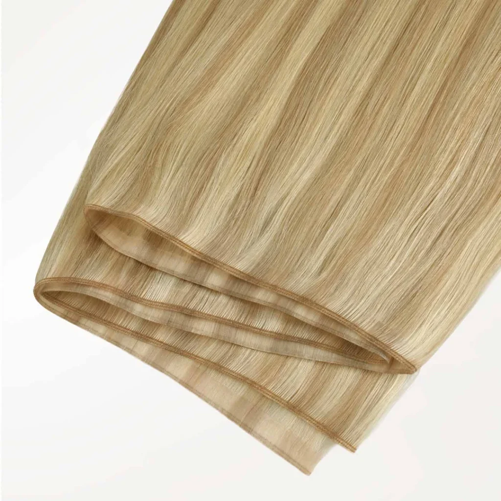 For the sandwich method, align a second weft over the first and press firmly to seal. If you want a lighter feel, use a single-sided tape strip to secure the top instead.