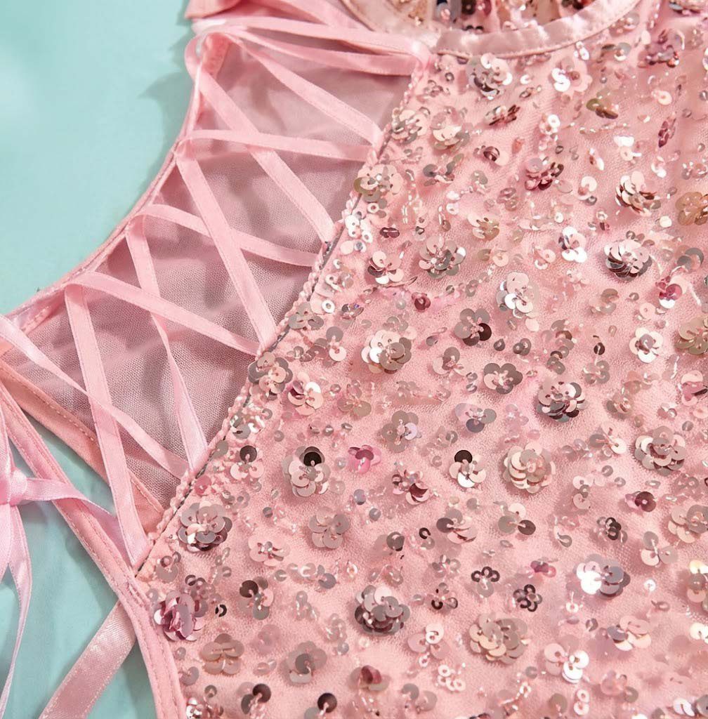 Designed for women who love refined yet bold lingerie, this bodysuit balances delicate sparkle with sculpted structure. The lace-up sides and supportive fit enhance your natural shape, while the soft pink tone adds a romantic, elevated feel that’s both alluring and elegant.