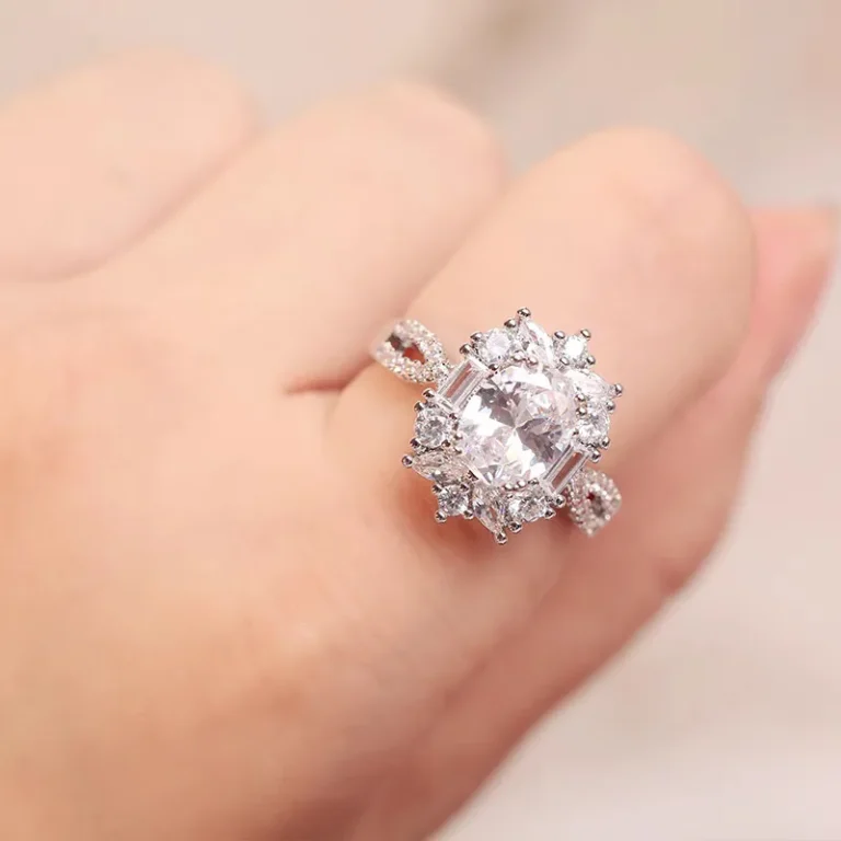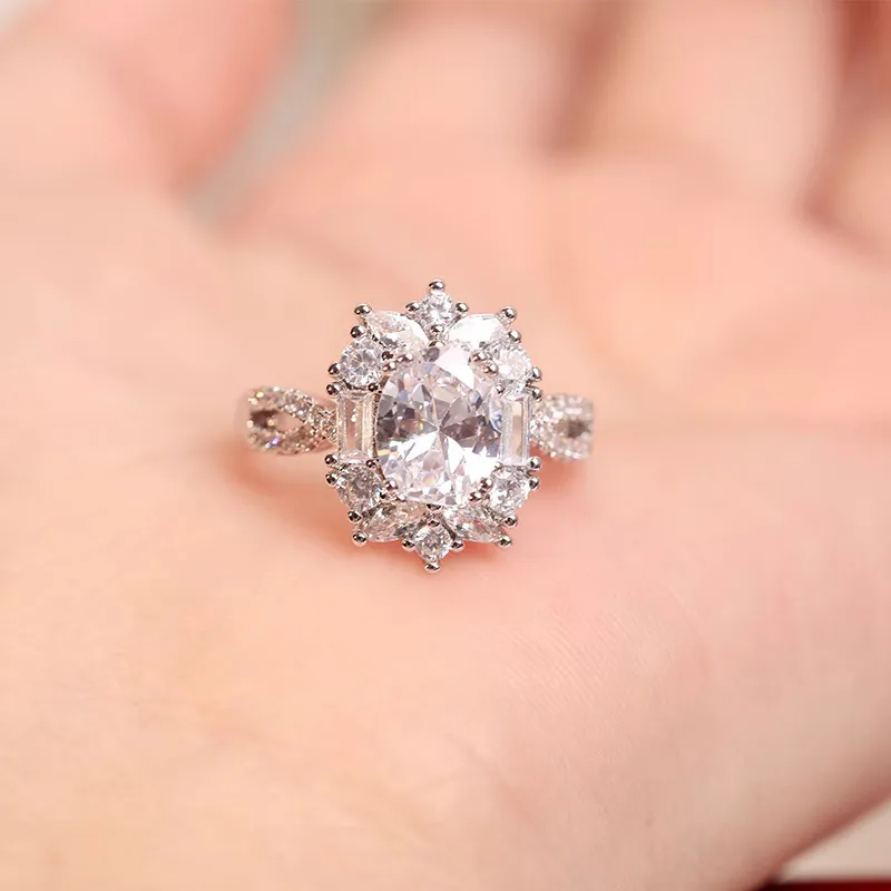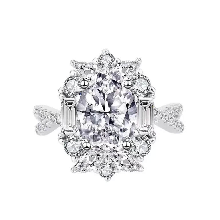 This ring is a masterclass in scale and classical elegance. The central oval is cradled in a structural setting that balances monumental size with refined detail. The cluster arrangement transitions seamlessly into a polished band, ensuring the focus remains entirely on the stone’s “white-fire” radiance. Designed for the woman who seeks the prestige of a custom bridal or statement piece, it delivers a red-carpet presence that is both provocative and timeless.